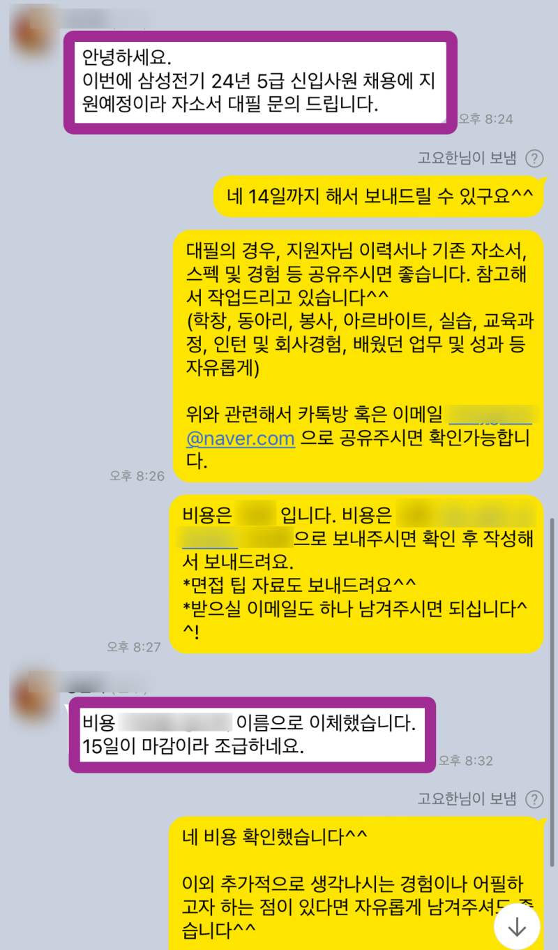 안녕하세요! 👋 대기업 자소서 합격 노하우를 아낌없이 전수해드리는 전문 컨설턴트입니다. 특히 삼성전기 같은 국내 최상위 대기업의 문턱을 넘으려는 수많은 지원자분들과 매년 1000명 이상 만나고 있죠. 그중에서도 수백 건의 대기업, 공기업 취업 합격 사례를 직접 만들어낸 경험을 바탕으로, 오늘은 여러분의 궁금증을 시원하게 풀어드릴 삼성전기 자기소개서 대필 성공기를 들고 왔습니다! ✨ 아, 이번 지원자분은 말이죠… 정말이지 자소서를 거의 새로 쓰는 수준으로 갈아엎었어요! 고객님이 처음 가져오신 자소서는 글자 수도 안 맞고, 본인의 강점도 제대로 녹여내지 못했더라고요. 제가 직접 문장 하나하나 고쳐가며 거의 새로 만들었다고 봐야 할 정도였죠. 다음부터는 제발 마감일 하루 전에는 와주세요..! 그래야 저도 이렇게 멋진 자소서를 여유 있게 만들어 드릴 수 있답니다! 😉